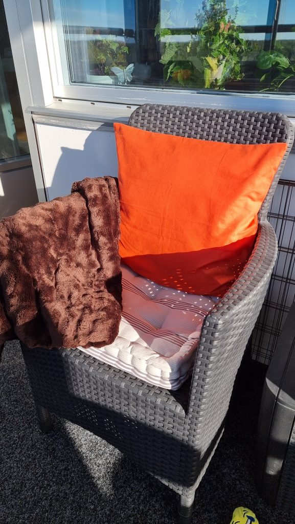 Vi vet fortfarande inte hur vi vill ha det där ute. Hyllorna passar ändå rätt bra, de ger förvaring och yta att ställa krukor eller kissar på. Fåtöljerna vi har är inte mina favoriter. De är svåra att sitta skönt i, och inget man kryper upp i. Jag skulle vilja hitta någon forma av mindre soffa, balkongen är stor, men inte jättedjup, och jag vill fortfarande kunna röra mig där ute. De soffor vi har tittat på blir för store, då de oftast är en hörnsoffa. Vi får se vad vi gör till våren, om vi kan hitta något som passar oss. Just nu är det i alla fall lysande orangea kuddar och mysiga bruna filtar som gäller.