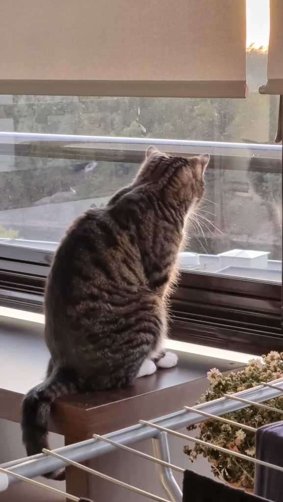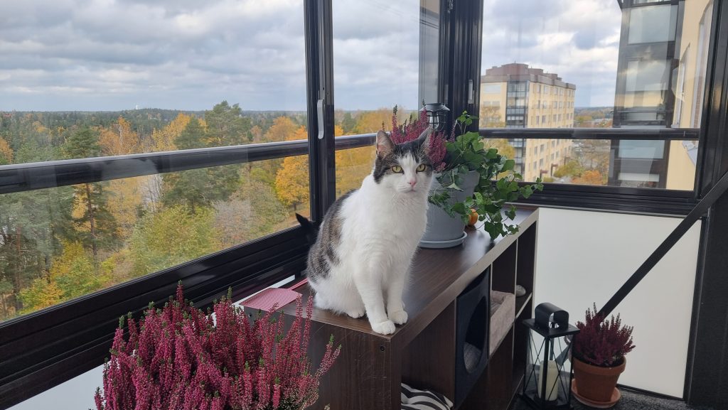 Katterna uppskattar verkligen att balkongen är inglasad. Även om det är svalare där ute njuter de fortfarande av solen och att sitta och titta ut på allt som rör sig…
